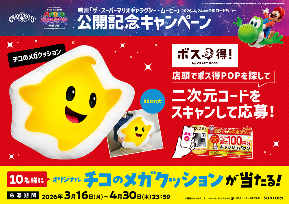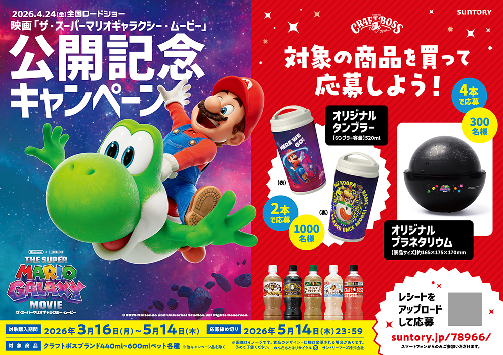 キャンペーンの詳細は「クラフトボス 映画『ザ・スーパーマリオギャラクシー・ムービー』公開記念コラボキャンペーンサイト」とBOSS公式Xアカウント(@_craftboss)に今後掲載していきます。